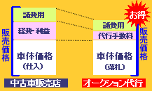 中古車販売店などは、仕入れた車体に多大な利益等を上乗せして販売します。しかし、オークション代行ではそのような上乗せする利益がありません。